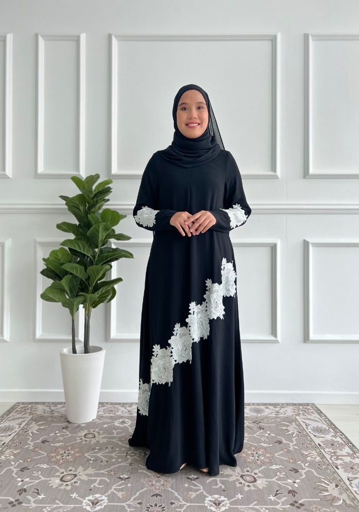 Code :JBH 8292 Material : Fursan Cutting : A- cut Jubah Embelishment : Patch lace floral with random stone