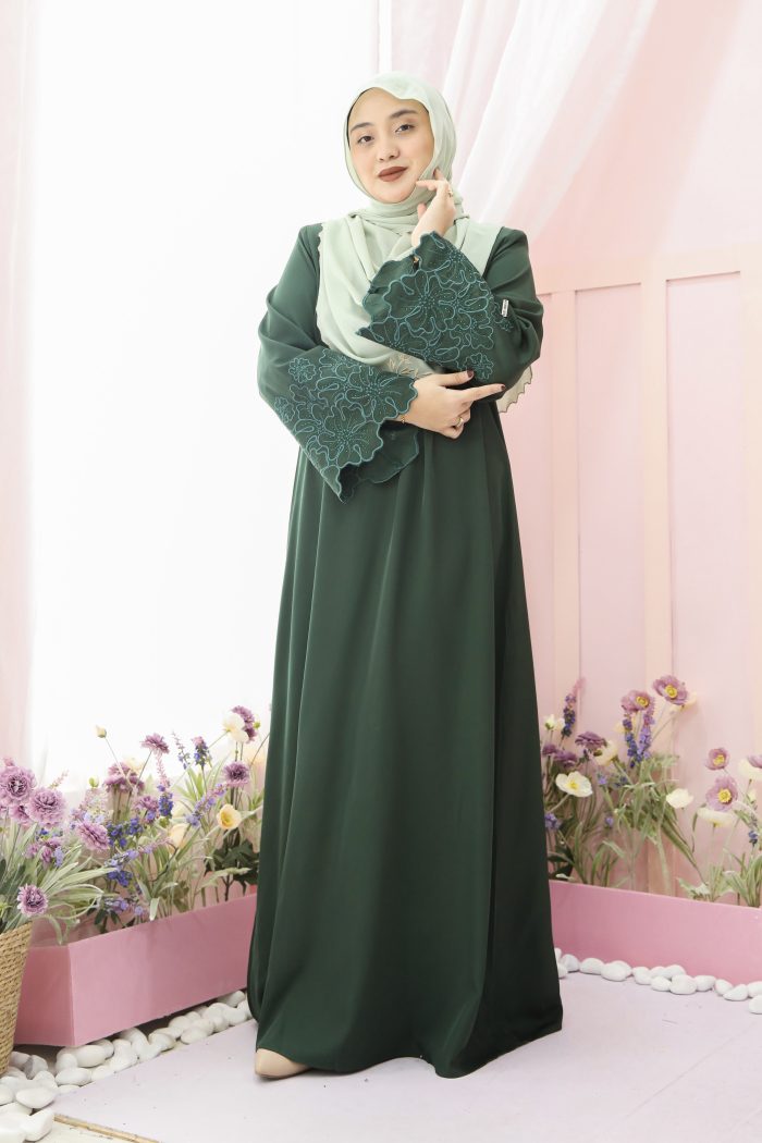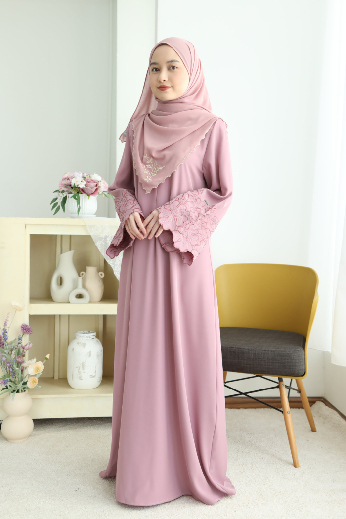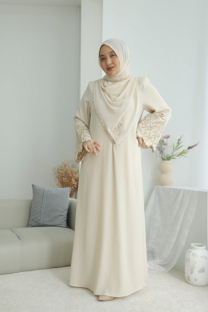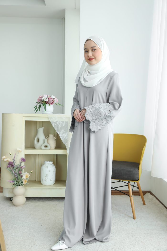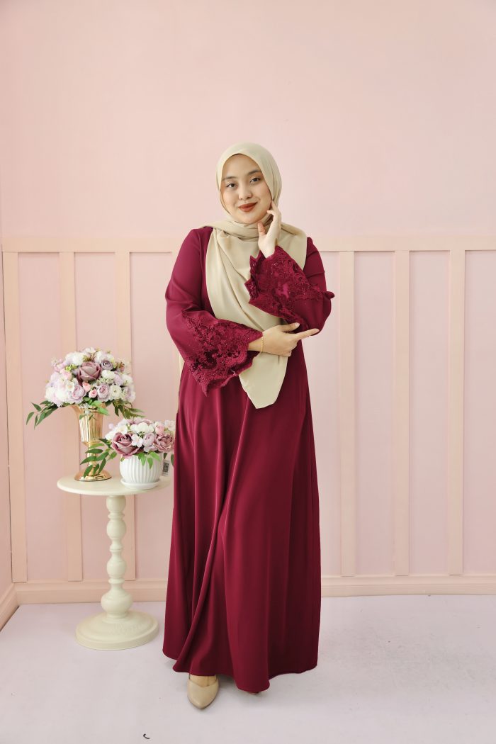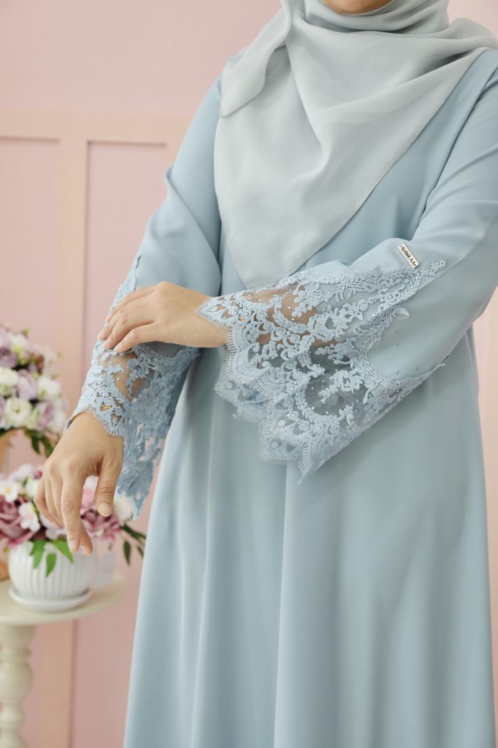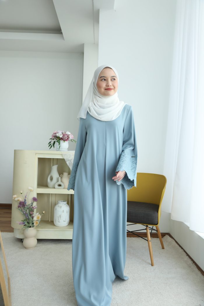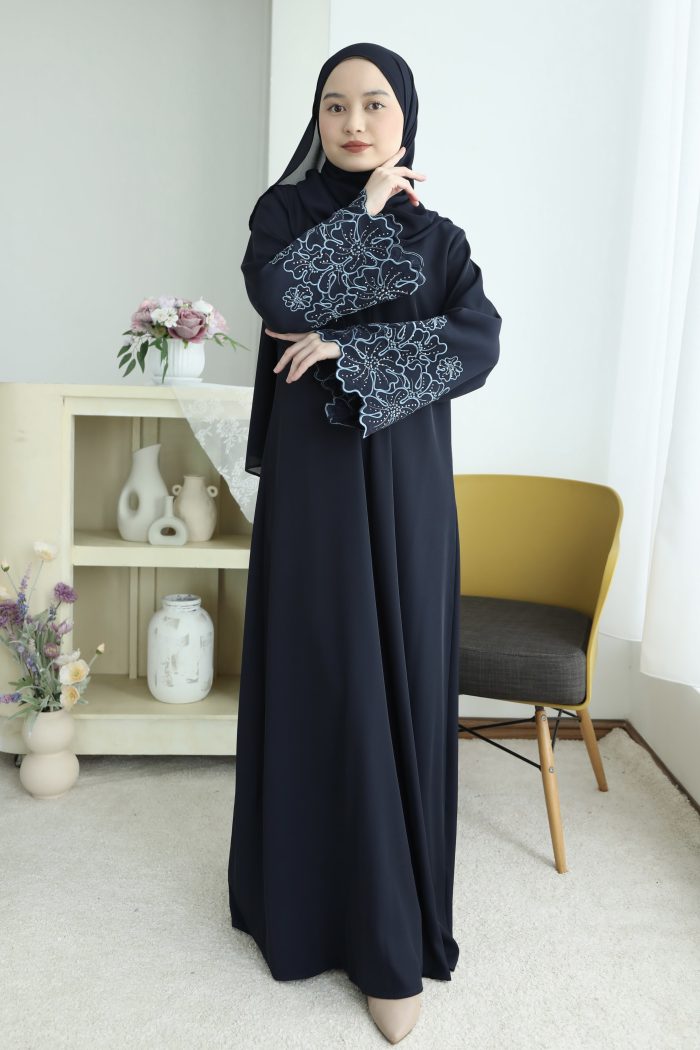 ABAYA AMANDA Code : JBH 8852 Colour : Off White Soft Nude Silver Grey Dusty Blue Dusty Pink Maroon Brick Orange Coco Brown Emerald Navy Blue Black Material : Matte Dubai Embellishment : Embroided Lace Cutting : A-Cut