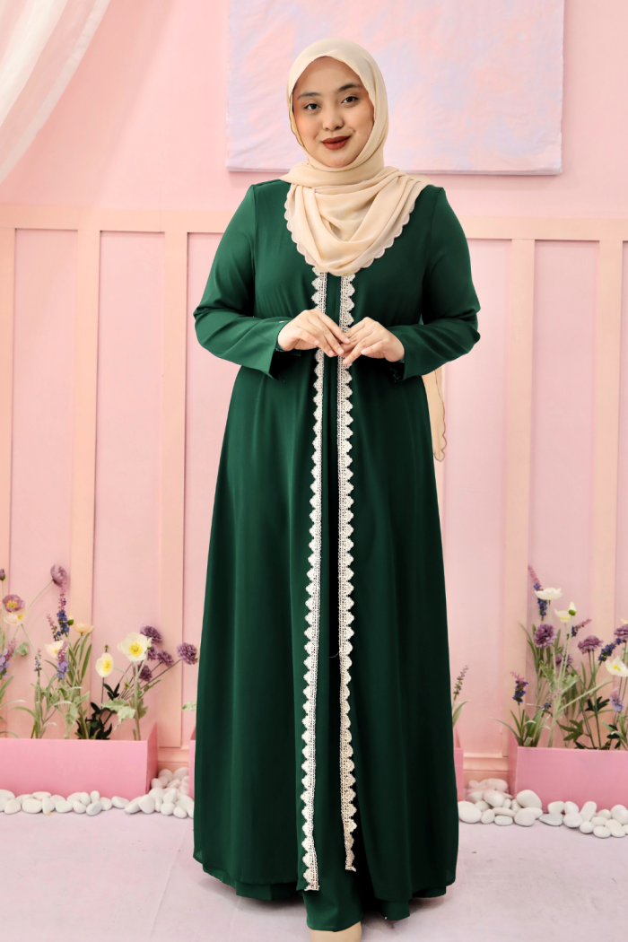 ABAYA QEISHA Code : JBH 8847 Colour : Off White Fushia Pink Peanut Brick Red Baby Blue Dusty Pink Emerald Green Navy Blue Black Material : Matte Dubai Embellishment : Sleeve Pleated Cutting : A-Cut