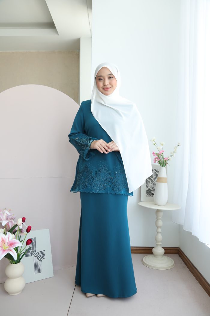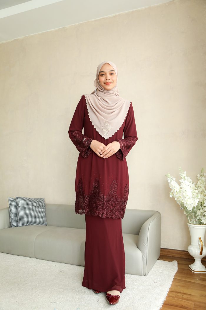 Kurung Hawa Code : BJK 20413 Colour : Soft Pink Lilac Red Maroon Navy Blue Teal Blue Material : Matte Dubai Embellishment : Embroided Lace Cutting : Kurung Moden