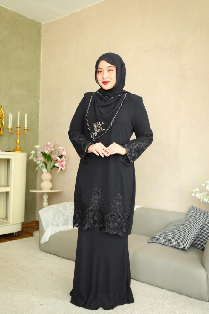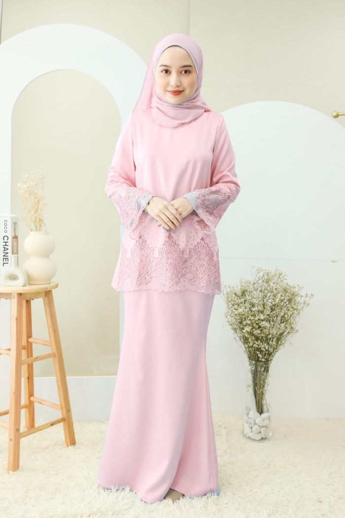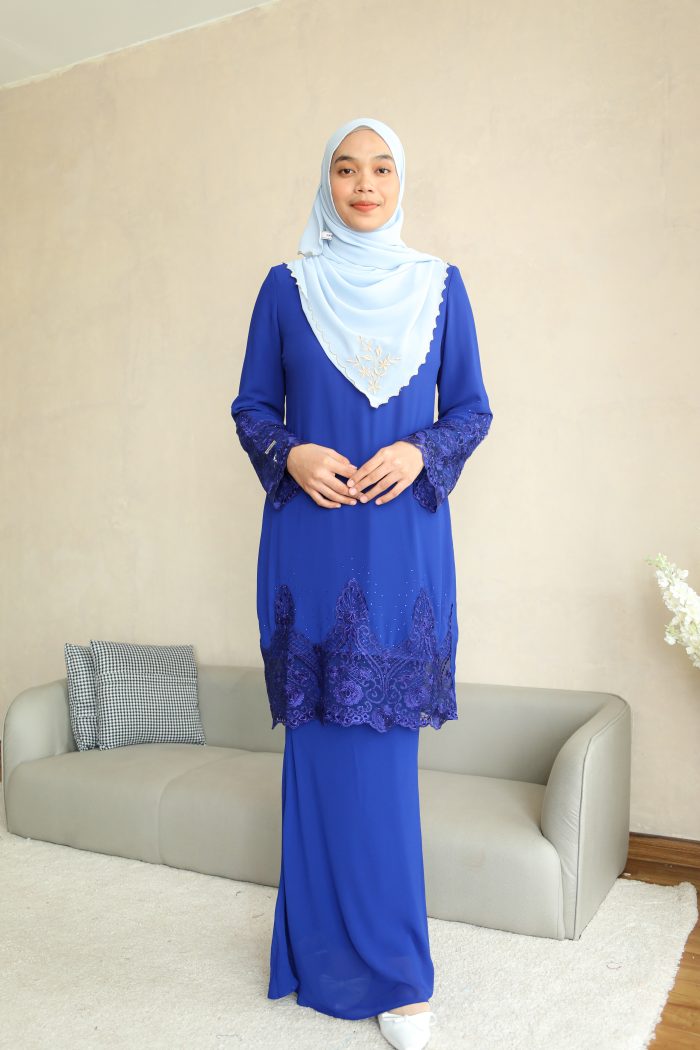 RM199.00Kurung Hawa Code : BJK 20413 Colour : Soft Pink Lilac Red Maroon Navy Blue Teal Blue Material : Matte Dubai Embellishment : Embroided Lace Cutting : Kurung Moden