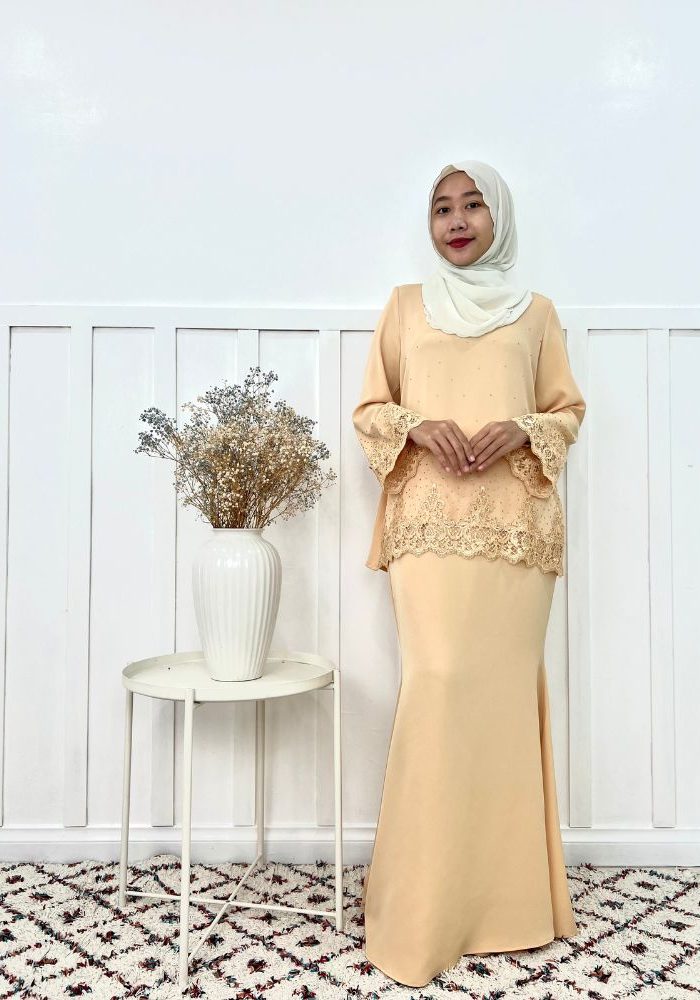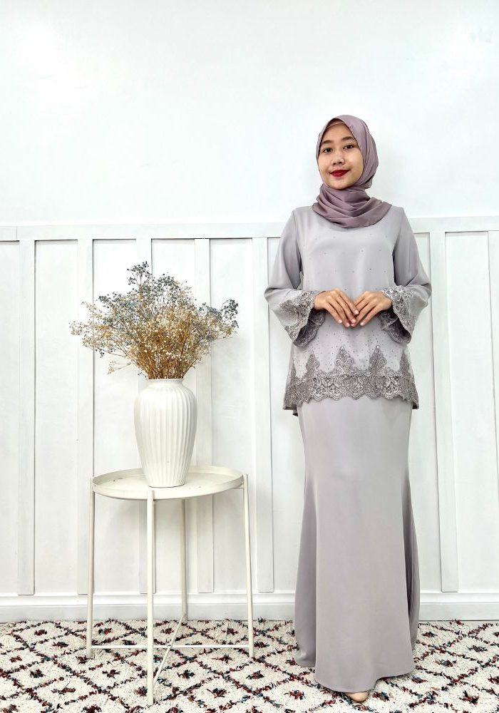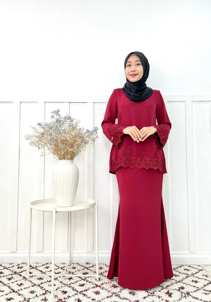 Code : BJK 20195 Material : Matte Dubai Cutting : Kurung Kedah with Mermaid Skirt Embelishment : Lace Patch on Sleeve and Top